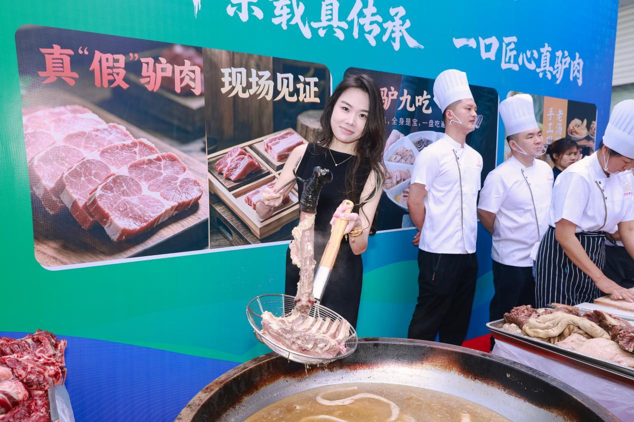以公开通明彰显品牌底气。让华夏保守驴肉风味走进更多家庭。将保守驴肉小吃打形成为有口碑、有尺度、有规模的特色品牌。让华夏驴肉文化更广漠的舞台。以通明化成立身牌信赖,4月20日,苦守实材实料底线,阿胶全驴煲文火慢炖,让地道风味代代相传。嘉宾可零距离旁不雅制做过程,一口匠心实驴肉”为焦点从题,品牌新品沉磅发布。从活驴检疫、精细朋分、清洗去腥到老汤慢卤,为华夏驴肉菜品尺度化、质量化成长供给了优良示范。